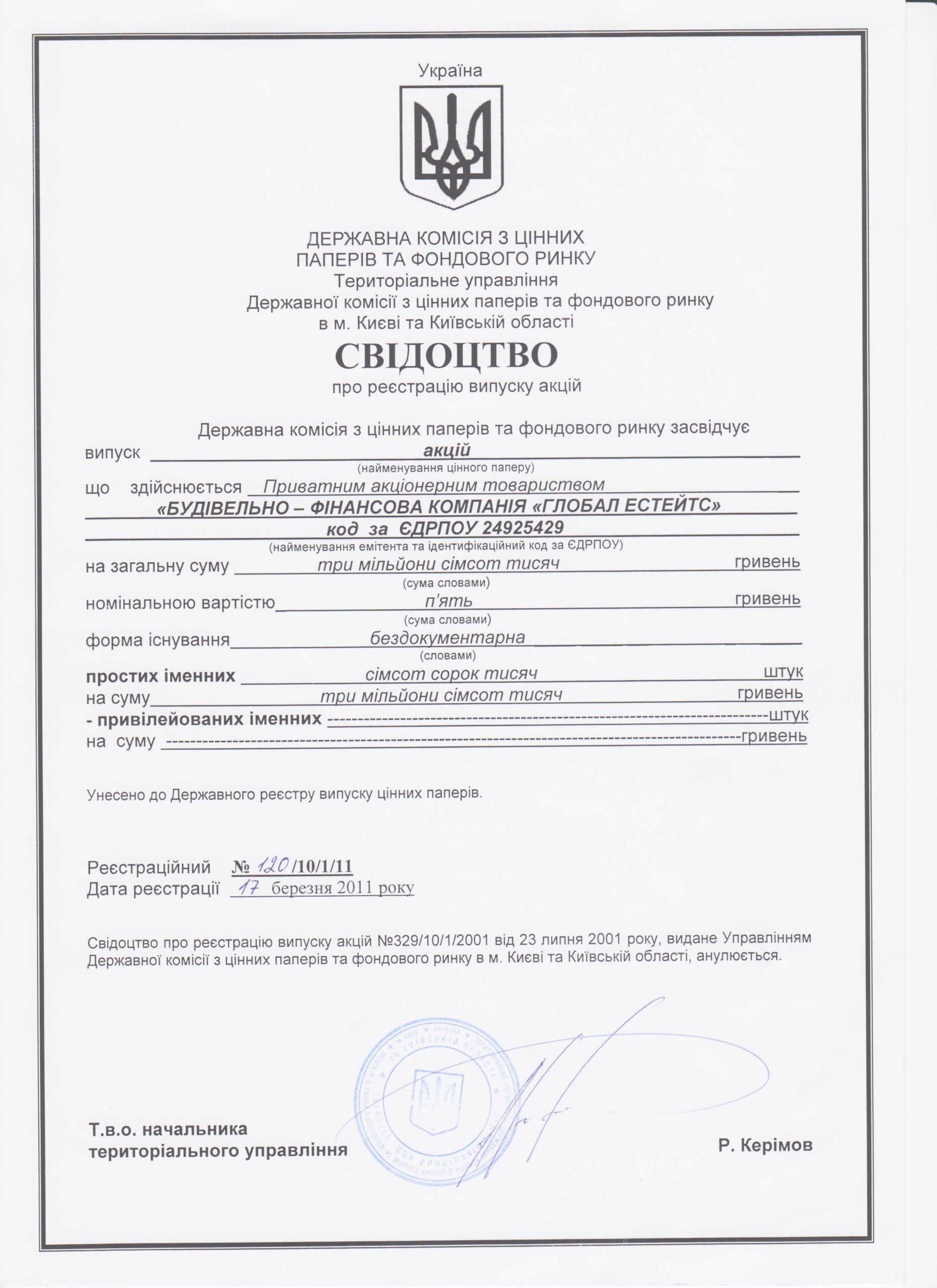 | Повне найменування: | ПРИВАТНЕ АКЦІОНЕРНЕ ТОВАРИСТВО «БУДІВЕЛЬНО – ФІНАНСОВА КОМПАНІЯ «ГЛОБАЛ ЕСТЕЙТС» |